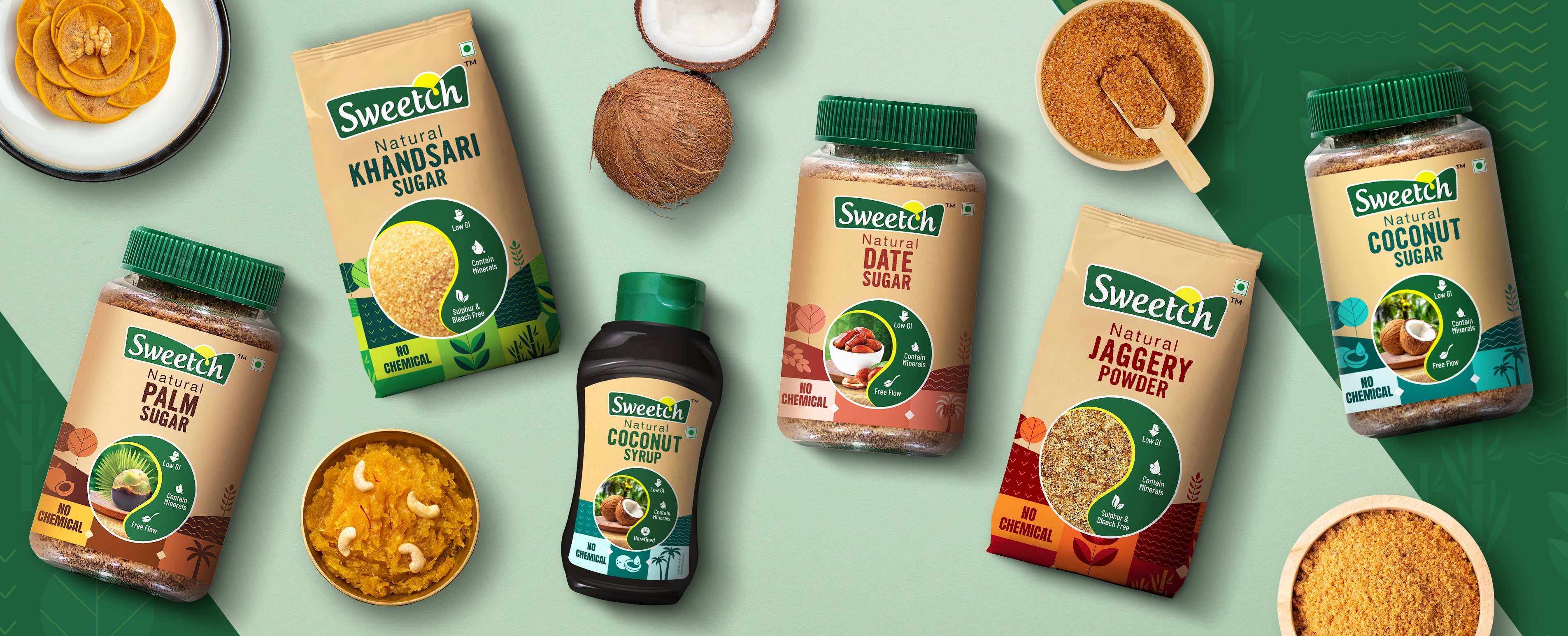 Package of Sweetch Natural Khandsari Sugar with product details on a green background.